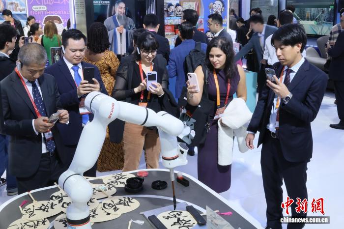 10月16日,第十届中国国际版权博览会在山东青岛举行。图为嘉宾驻足山东展区观看机械臂写字。张晓鹏 摄