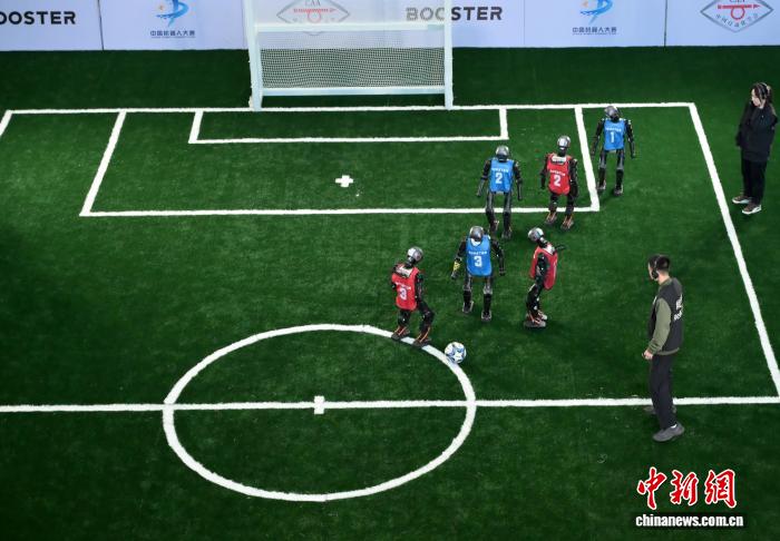 10月17日,2025中国机器人大赛暨Robocup机器人世界杯中国赛在河北石家庄举行。本次大赛吸引了清华大学、上海交通大学等300多所国内高校参加,众多机器人爱好者共同见证了这场科技盛宴。图为机器人足球比赛场景。中新社记者 翟玉佳 摄